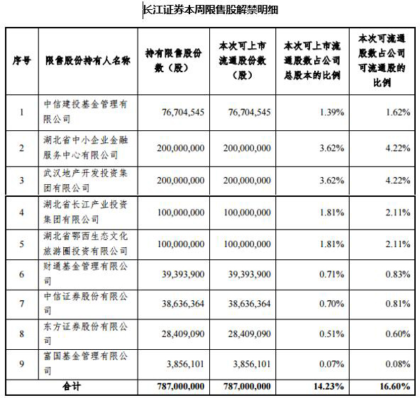 长江证券8月1日有7.87亿限售股上市流通,解禁占比14.23%,解禁市值约74.69亿元。