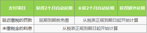 如果您获得了两个月自动延期,在延期到期日前,您不会被征收延迟缴税的罚金,但您仍需支付未缴税金的利息,利息从税表正规到期日起开始计算。
