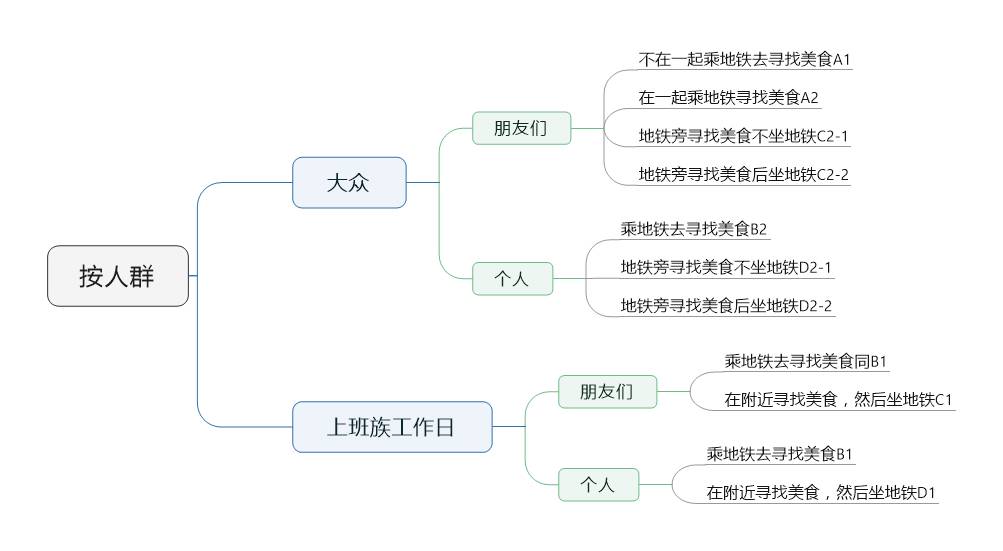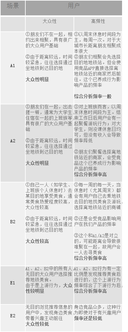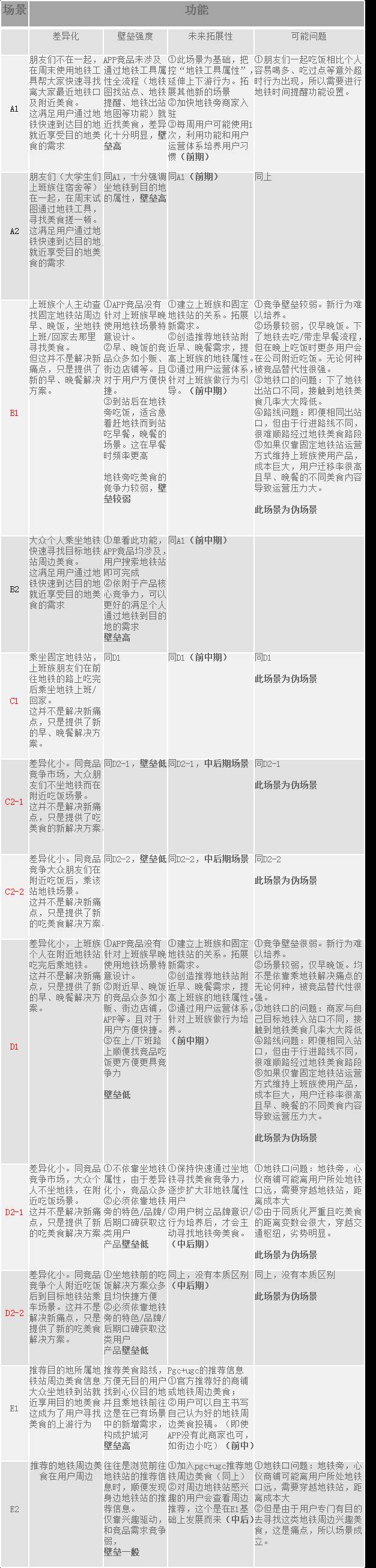 1. 我们得出了针对地铁美食,上班族工作日使用产品的全部是伪场景。即B1、C1、C2、D1、D2;可以考虑做的场景都是大众用户乘地铁到目标地铁站(非上班固定地铁站)的场景,即A1、A2、B2、E1、E2;