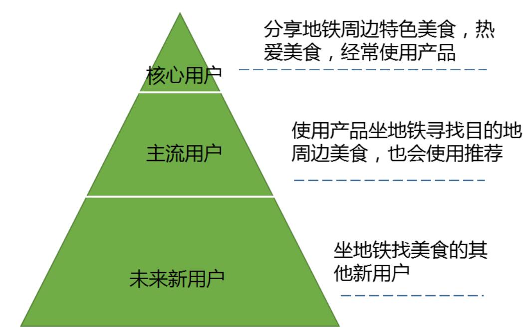 结合上图和要做的场景,我们得出了产品具体目标用户:乘坐地铁快速到达并寻找目的地美食的大众用户(上班族休息日,大学生,个人或一起),要求在地铁站附近便能方便享受目的地美食。且对美食有一定热爱程度。
