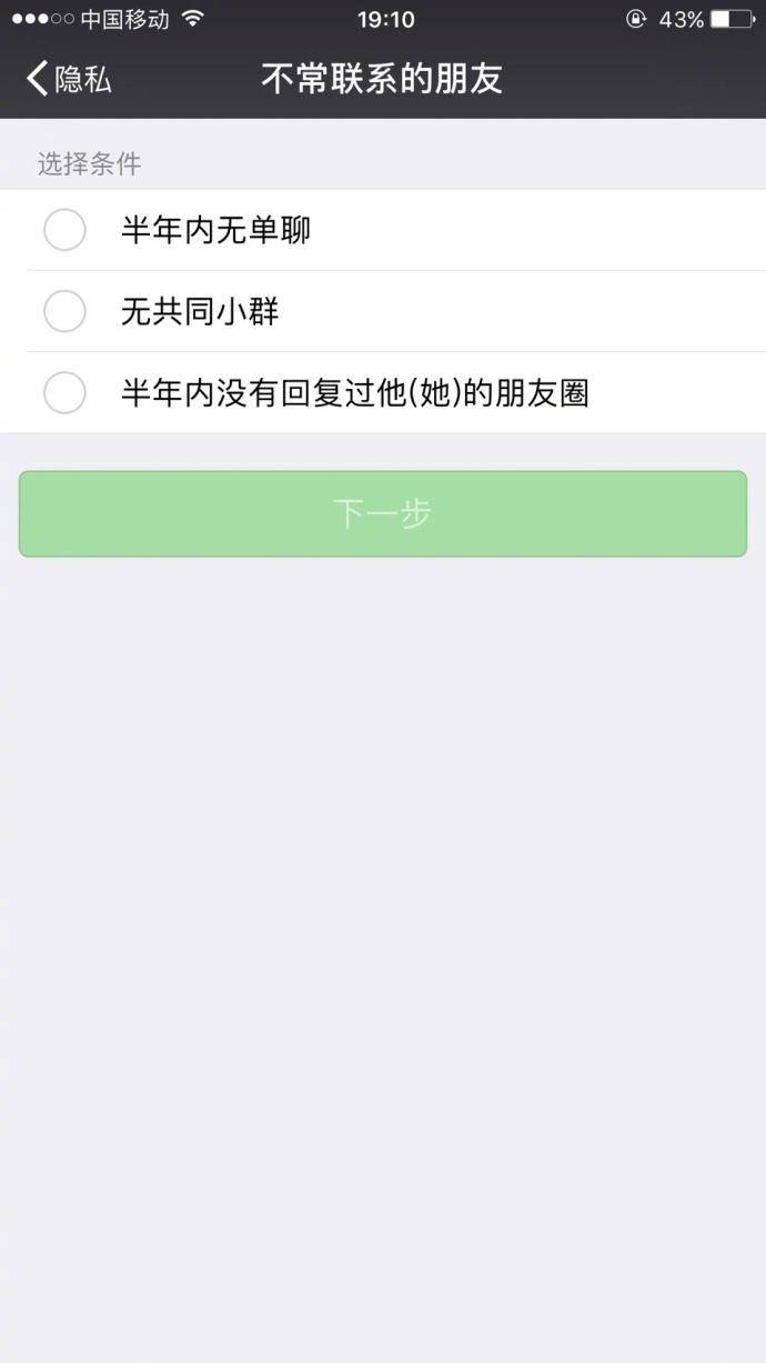 不常联系的朋友选项包括半年内无单聊、无共同小群、半年内没有回复过他(她)的朋友圈。