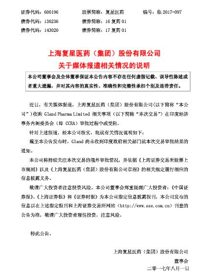 2017年7月27日晚间,复星医药发布公告称,上述收购案目前尚需等待印度经济事务内阁委员会(CCEA)审核批准,所以经交易各方协商,宣布将交易之终止日进一步延长至 2017年9月26日。