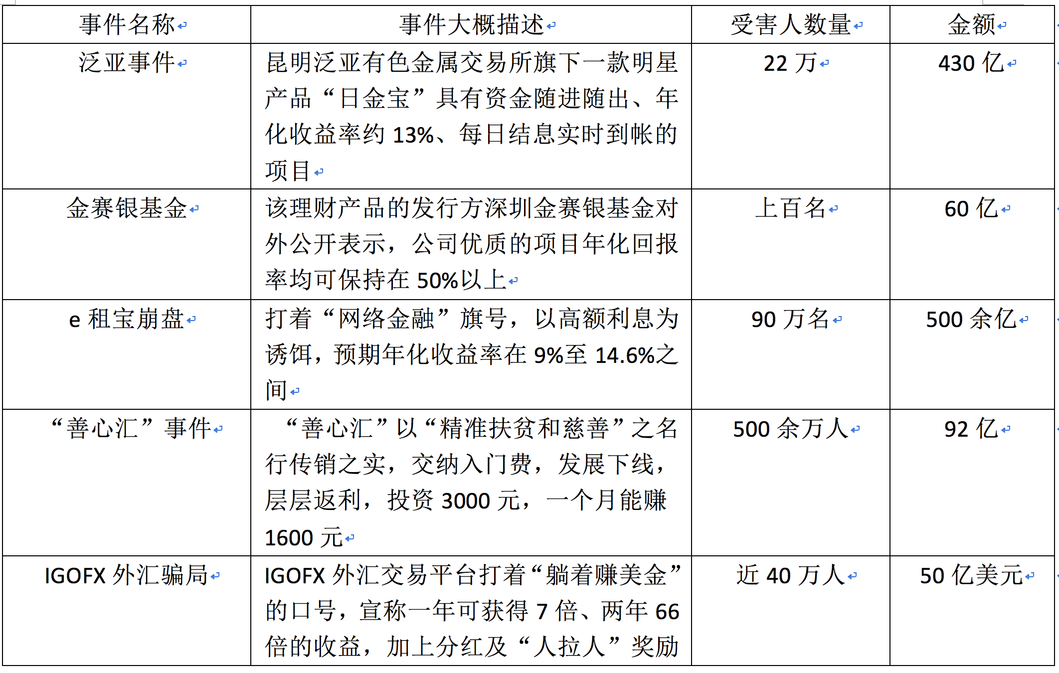 从2015年泛亚贵金属事件、金赛银事件,去年e租宝崩盘,2017年民生银行飞单、“善心汇”事件,IGOFX崩盘案,包括民间各种数字货币、传销币层出不穷,互联网金融P2P各种跑路事件。每次金额动辄上百亿,数十万人血本无归。