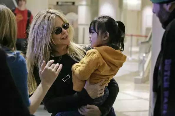图为美国好莱坞甜姐儿梅格瑞恩抱着收养自中国的女儿Daisy