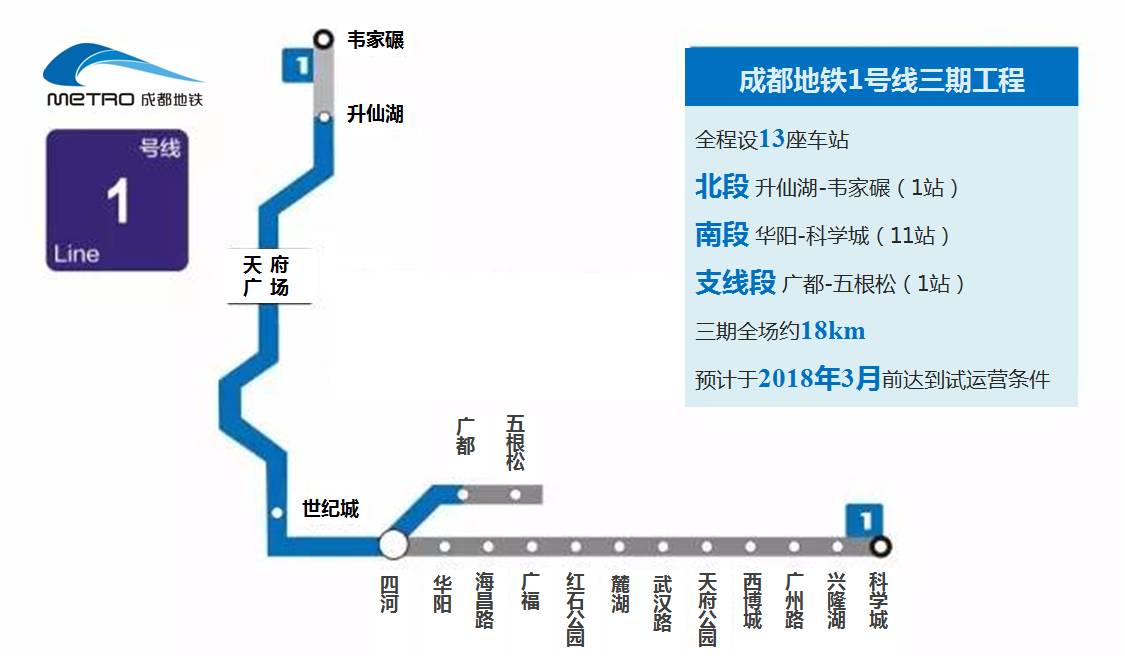 成都地铁1号线三期工程全程设置13座车站。其中北段为升仙湖-韦家碾,设韦家碾站;支线段为广都-五根松,设五根松站;南段为华阳-科学城,设华阳、海昌路、广福、红石公园、麓湖、武汉路、天府公园、西博城、广州路、兴隆湖、科学城共11个站。