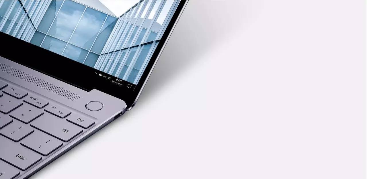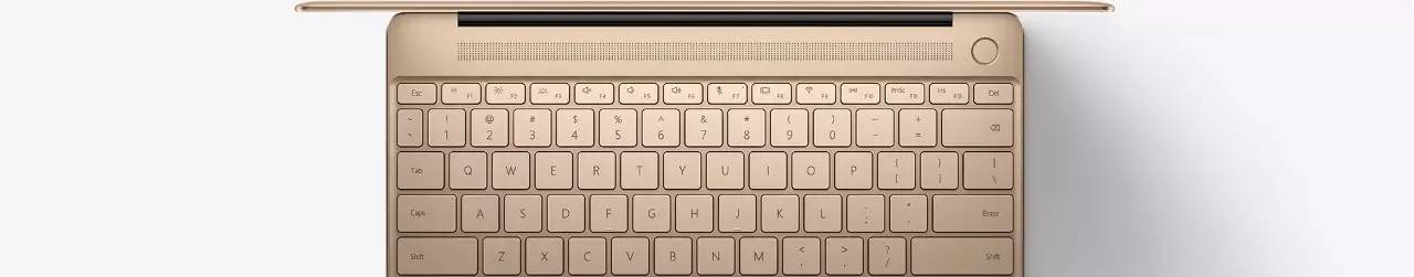 亮屏之后,Matebook X的B面和C面第一感还是非常漂亮的,键盘布局紧凑,镜面屏与金属机身契合得当,细节处理到位,给人的感觉很精致。1公斤左右的重量,可以满足单手开合,这一点在实际使用中还是非常方便的。在看到C面的键盘和外放布局之后,就能感觉到这款笔记本的目标竞品就是Macbook,还是不得不说,两者实在是太像了。