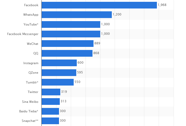 主要社交媒体MAU排名 (单位:百万;时间:2017年4月;数据来源:Statista)