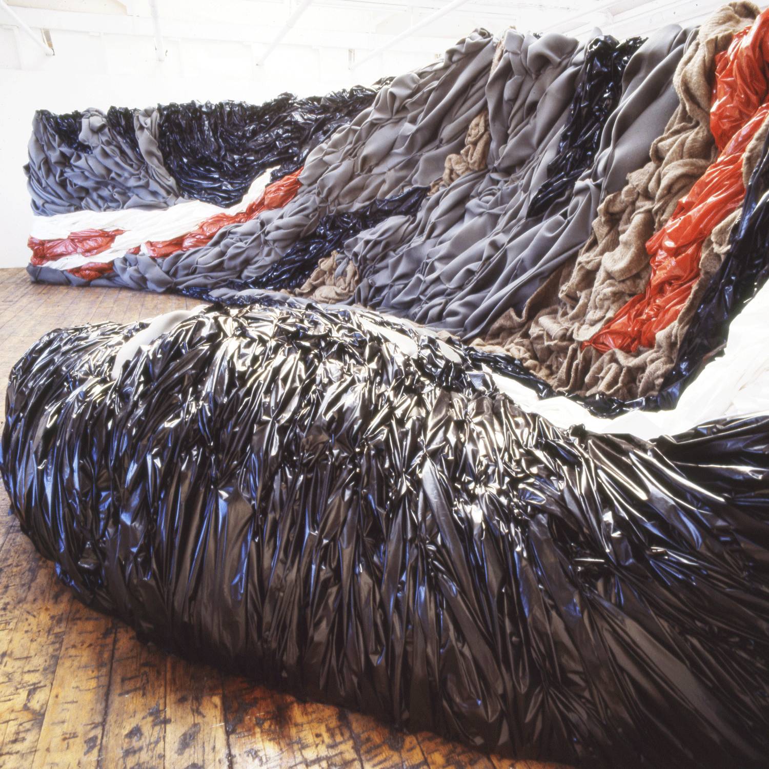 像2017秋冬系列,他们把当代英国装置艺术家Phyllida Barlow的作品《Expanse》,和美国知名雕塑家Robert Morris的《Untitled(Brown Felt)》,弄成了很有触感的线织面料,宽大飘逸的腰带和饰带。