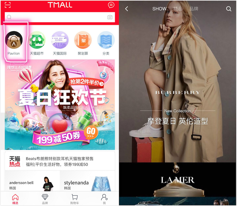 8月1日,天猫的奢侈品虚拟App Luxury Pavilion上线,目前在这个专门出售奢侈品的平台上能看到的品牌有时装品牌Burberry和Hugo Boss、护肤品牌La Mer和娇兰、汽车品牌玛莎拉蒂以及腕表品牌真力时等共17个。所谓虚拟App,其实指的是在天猫上将会出现一个Pavilion的入口,点击进去后,出现和天猫App惯常界面不一样的页面,用户将可以在上面选购奢侈品。
