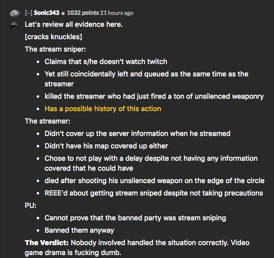 这很快就变成了一个极受关注的事件。lotoe的朋友以及拥护者称他没有看直播,因此他并没有“追杀”Shroud,这也成为了《绝地求生》reddit子板块里讨论最为热烈的话题。