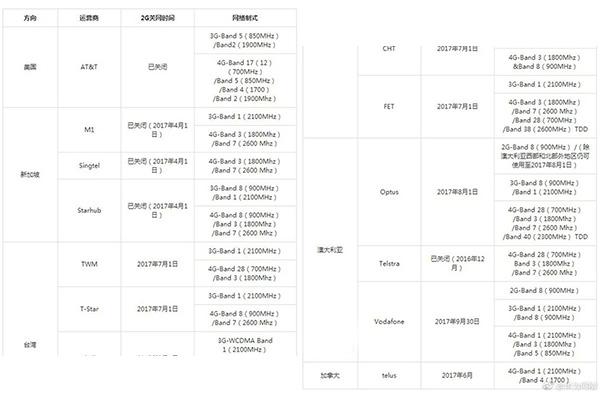 下图为移动发布的表格。其中显示美国已全面关闭2G网络,新加坡已于今年4月1日全面关闭2G网络,中国台湾地区已于今年7月1日全面关闭2G网络,澳大利亚最晚将于今年9月30日全面关闭2G网络,加拿大在今年6月全面关闭2G网络。
