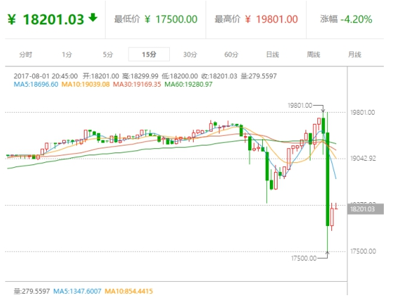 新币推出后不久,前一分钟价值还在19700元每块的比特币已经下跌至17500元,由涨逾4%转为跌逾6%,下跌接近2000元,而后有些微回升,截至界面新闻发稿时,比特币价格基本交投稳定于18000元。