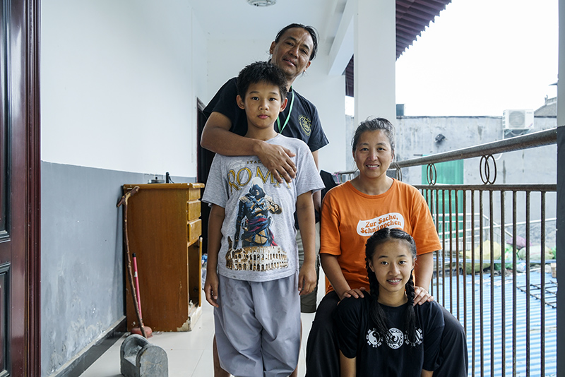 Floridn一家四口在宿舍门前合照。