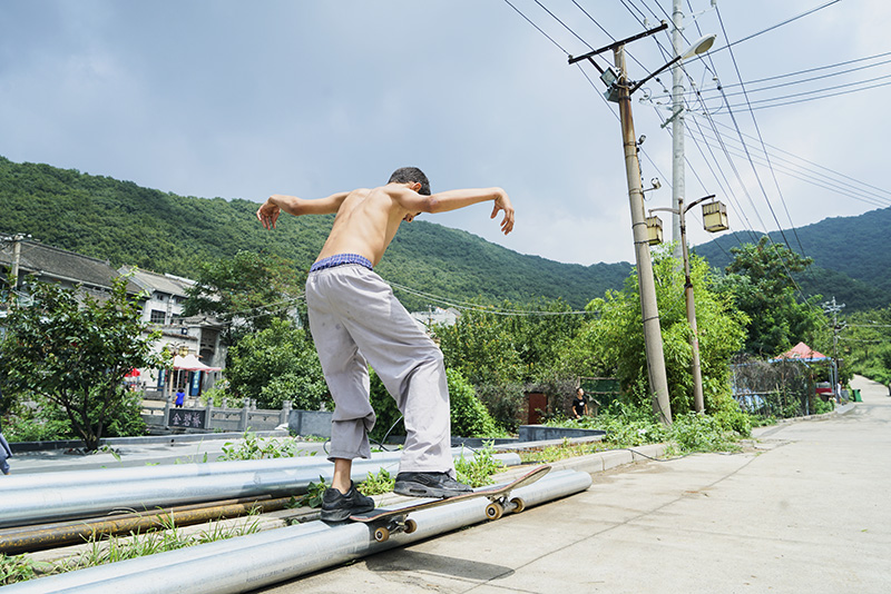 午休时,Nessim在路边玩起了滑板。