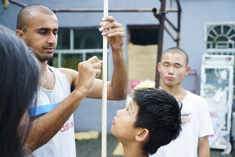 热身结束后,延仹开始逐个点评学生们的功夫。由于语言不通,他多靠动作进行指导。几个学生都学会了简单的汉语,但熟练说汉语的沈沙沙更常从旁帮助翻译。