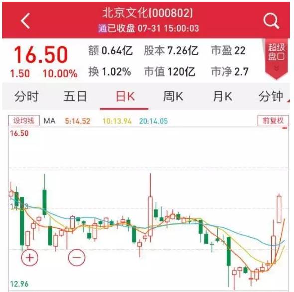 在《战狼2》火热的背后,对其承诺保底发行的北京文化(000802.SZ)成为最大收益方。7月31日,北京文化更是一字涨停,报收16.5元/股,涨幅10%。实际上,自7月27日,《战狼2》上影当天,一直股价低迷的北京文化便开始逆势上涨,至7月31日收盘,仅仅三个交易日,其累计涨幅便已近22%。