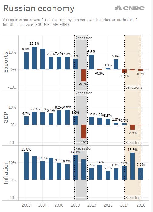 与此同时,欧盟也推出了针对其金融、国防和能源业的制裁。再加上全球油价暴跌导致俄罗斯的出口收入大幅减少,该国经济遭遇重创。