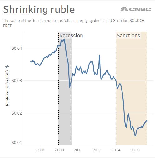 据CNBC报道,美国国会研究处(Congressional Research Service)2017年的一项研究指出,石油收入锐减60%,造成俄罗斯卢布大跌,进而导致商品价格飙升。