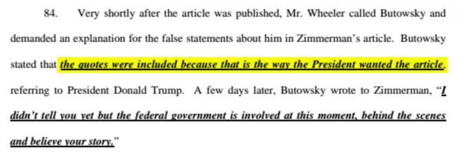 直到这则新闻刊发出来,惠勒才发现里面有多处引用他的话,而他自称从来没说过这些话。他在诉状里说,当他表达不满后,巴图斯凯尔再次提到了总统,“这些话被加进去,是因为总统希望这篇报道以这个样子呈现”。