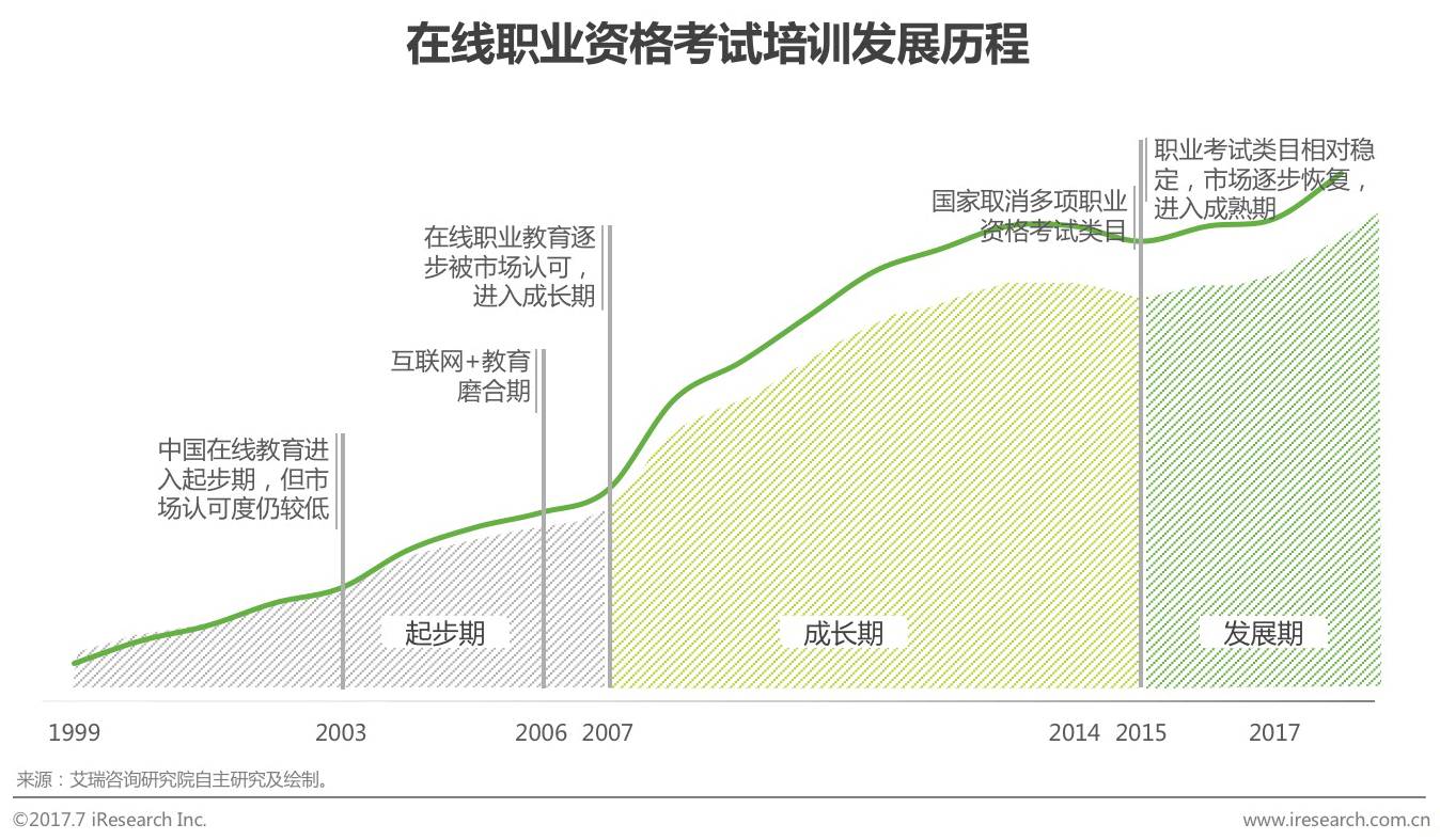 在线职业资格考试培训市场发展可以分两个方向来看,一是跟着在线教育方向走,从1999年开始,中国在线职业教育开始起步,市场认可度较低,公司还未具规模,2003-2006年之间互联网+教育充分磨合,从2007年开始,在线职业教育逐步被市场认可,进入成长期,伴随着资本层面的助力,在线职业教育逐渐拥有清晰的商业模式,用户规模高速增长;二是跟着国家政策走,2014与2015年对于资格考试的两次取消使得市场受到一些冲击,大部分资格考试在2016年前完成,当前已相对稳定,逐渐恢复,走入高速发展阶段,稳步向成熟期过渡。