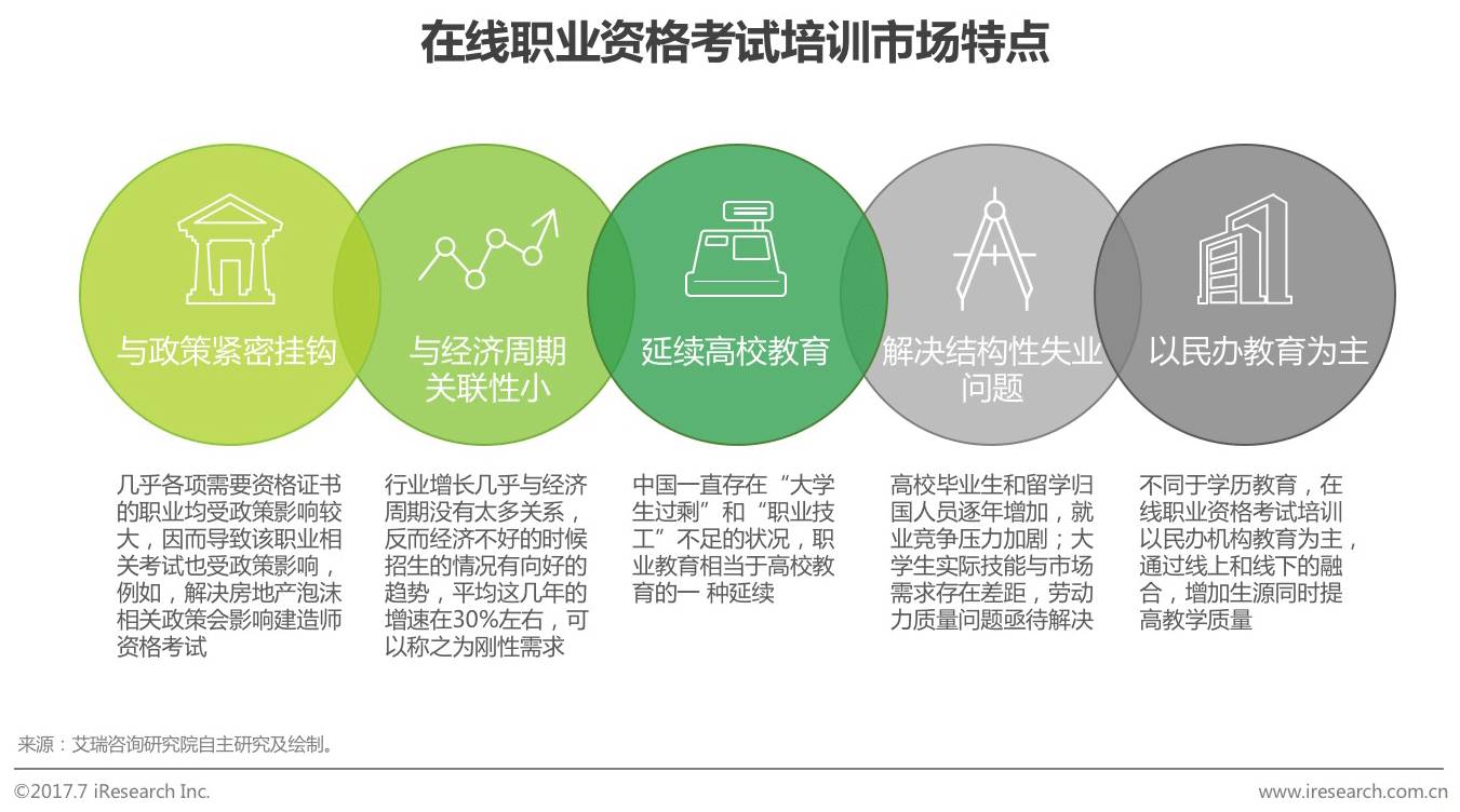 中国的教育公平化被提及很久,其中很重要的就是教育资源的不平衡。在职业资格考试培训市场中,互联网作为扁平化的工具,解决了受众人群无法定时定点参加资格考试培训的问题,提升了参培率,某种程度上熨平了传统线下机构的沟壑。另外,虽然职业资格考试培训与政策挂钩,但艾瑞分析认为,未来相关政策虽有增有减,但波动不会太大,并且,职业资格考试培训与经济周期关联性小,经济增长缓慢的情况下参加培训的人数反而会增加,因此,市场发展前景比较被看好。