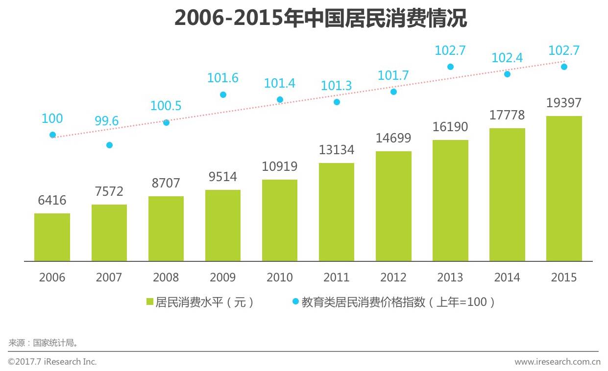 根据国家统计局数据,2006-2015年中国居民消费水平稳步上升,从不足万元到接近2万人民币,增长达到三倍左右,其中,教育类居民消费虽逐年波动不大,但总体来说呈正斜率趋势,从2013年开始,教育类消费价格指数均保持在102以上,居民对教育的重视度显而易见,未来教育市场的发展空间巨大。