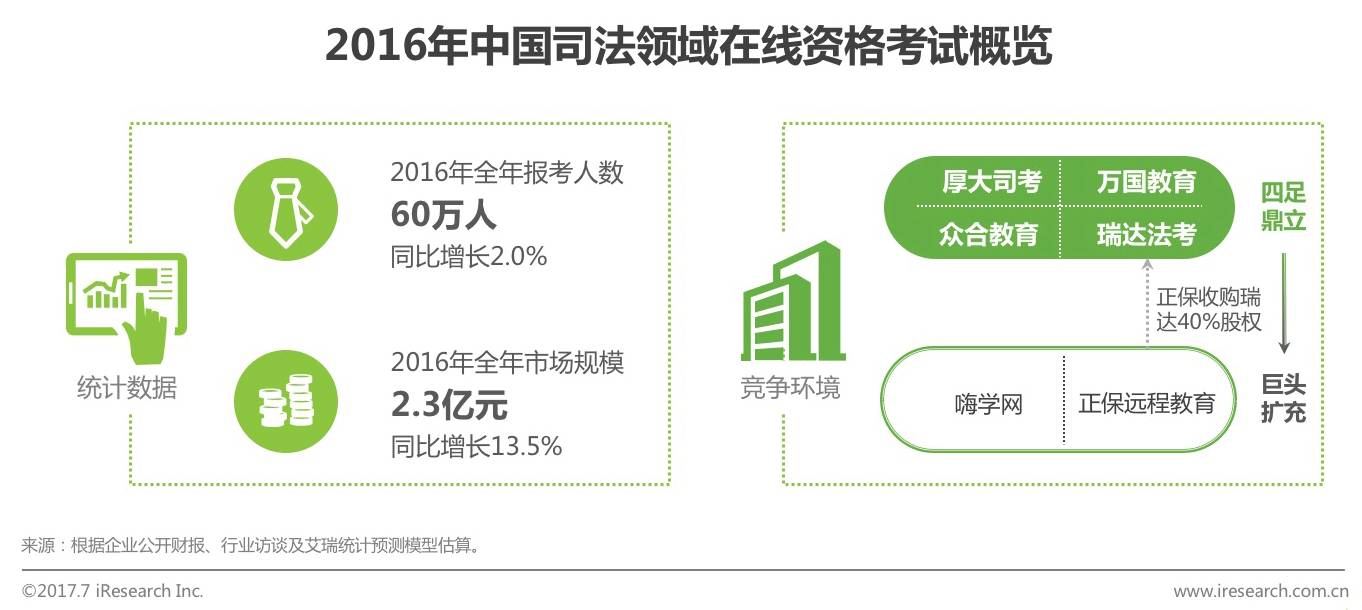 4. 司法类在线职业资格考试培训市场2016报考人数为60万人,市场规模达到2.3亿元,2016年国家统一法律职业资格制度对市场有利有弊,预计近几年,政策方面对司考总体人口基数受到的影响将较小。