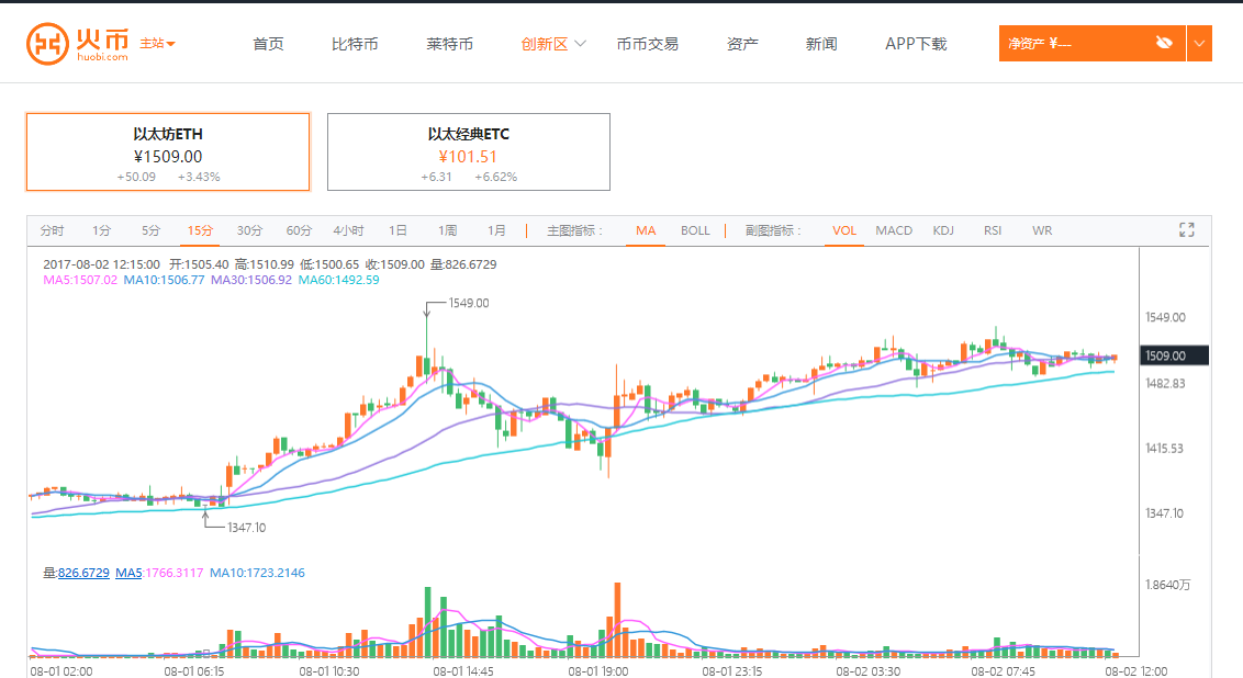 根据以太坊交易平台火币网行情显示,截至北京时间8月2日12点,以太坊价格为1509元人民币。火币网以太坊今日开盘价格为1458.9元,目前最高价格为1540元,最低价格为1446.5元,涨幅3.43%。