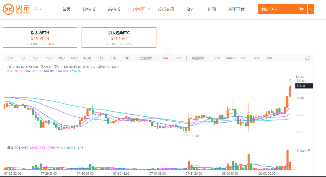 ETC以太经典行情小时图来自火币网
