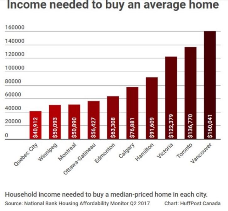 在住房负担能力上,加国各地区的整体差异在拉大。比如温哥华购房家庭每月平均还贷为4268加元,多伦多为3647加元,但在蒙特利尔家庭只需还贷1357加元。这意味着,如果要在温哥华买房,购房者家庭收入最好能达到蒙特利尔居民的三倍以上。但实际却很难达到。还贷水平高的地区,居民收入水平未见上涨。蒙特利尔典型家庭的年收入能达到58961加元,而温哥华为68219加元,仅多了1万元。