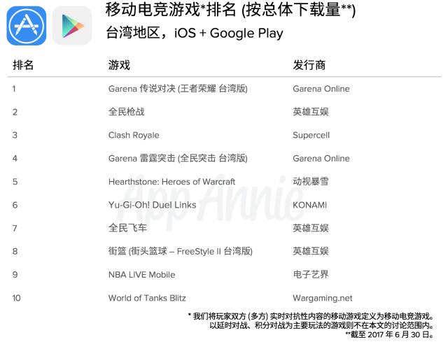全球移动电竞市场快速增长同样反应在港台地区,以市场规模更大的台湾来看,已经有来自世界各地的移动电竞游戏在台湾市场取得成功。例如,被称为“王者荣耀台湾版”的《Garena 传说对决》,总体 iOS + Google Play 下载量在台湾移动电竞游戏中高居第一。英雄互娱在台湾地区电竞市场也有积累,旗下电竞产品《全民枪战》、《全民飞车》及《街头篮球》(台湾)在移动电竞产品中总体下载排名分别位列第 2、第 7 及第 8 位。Supercell 的《部落冲突:皇室战争 (Clash Royale)》和动视暴雪的《炉石传说 (Hearthstone)》拿下第 3、第 5 名。