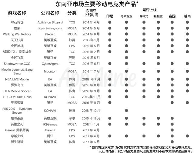 目前,主要移动电竞手游公司在东南亚地区均有动作。由于东南亚地区国家众多,经济和文化具有复杂性。因此,在产品上需要深谙各国玩家的喜好和文化习惯,根据目标国家在喜好题材、语言风格的差异,为其量身定制出合适的游戏。这导致不同游戏在东南亚地区的上线情况不同。