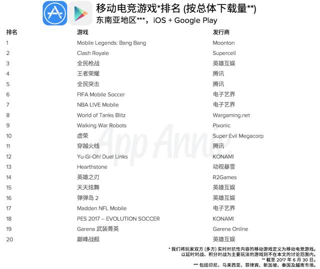 App Annie 近期发布的《中国移动游戏继续在海外市场大放异彩》报告显示中国移动游戏开发商在东南亚地区成绩非常突出,这也同样体现在了中国移动电竞游戏在东南亚市场的表现当中。以同样在东南亚地区运营的《王者荣耀》为例,该游戏目前仅登陆印尼、泰国、越南三国,可见面对较为复杂的市场差异,厂商仍需要审慎。从运营成绩来看,《王者荣耀》长期居于当地市场排行榜前列,《王者荣耀》在东南亚市场的成功仍证明了腾讯在手游开发和全球运营的实力。