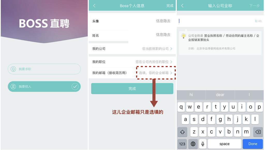 尽管BOSS直聘还设有一个【Boss身份认证】的选项,需要用已经注册公司的域名邮箱进行认证,但这个认证并非必须的,只是一个招聘效率更高的选项,而这个认证选项原本可以成为一道监管屏障。