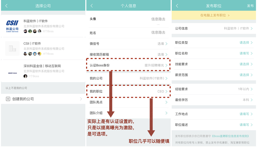 BOSS直聘在设置流程中意识到了身份认证的必要性,但在交互设计中,并没有将它提高到必要的安全级别。任何用户,都可以以任意公司的身份发布职位。