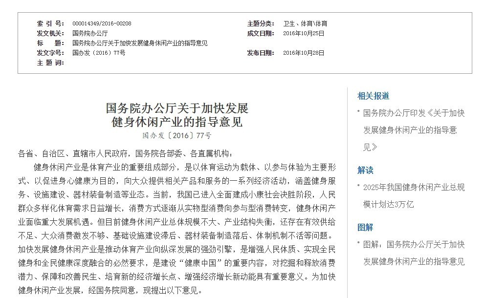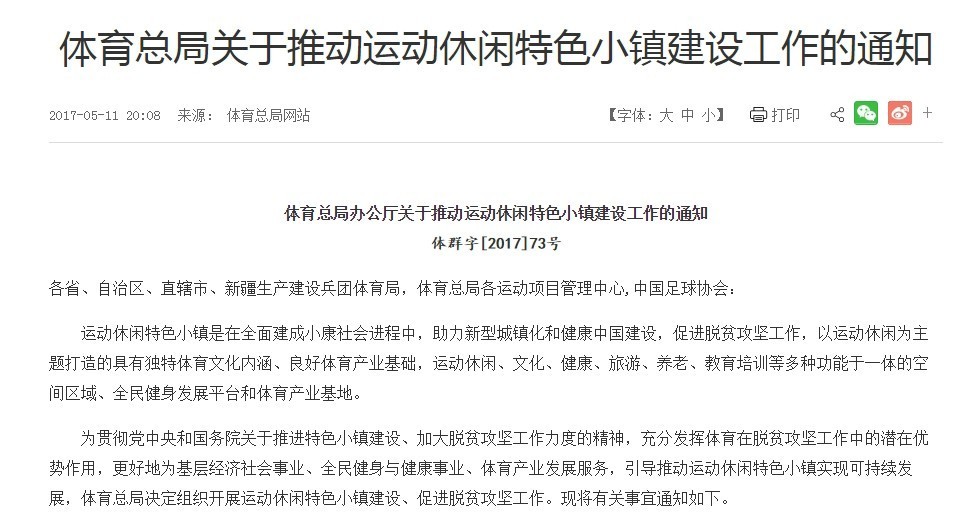对于根基薄弱的中国体育产业而言,那些能够整合政府政策与社会资本的全新概念正在成为这一行业的强大驱动力,而在这其中,体育小镇无疑是最具想象力的概念。按理说,中国体育产业并非暴利行业、投资回报周期也颇为漫长,资本进入应该足够慎重,但与此同时,它却又是最容易激发资本想象力的行业,有时单靠一个政策或概念就让资本趋之若鹜。在某种程度上而言,过去两年中国体育产业的热度几乎全源于一纸国务院46号文。而当2016年底体育产业热度有所回落之际,国务院办公厅又适时推出了77号文,即《国务院办公厅关于加快发展健身休闲产业的指导意见》,而77号文对于体育产业的最大贡献就是间接孵化出了运动休闲小镇(或简称“体育小镇”)这一全新的产业概念,如无意外,运动休闲小镇将是中国体育产业在接下来两年中最热门的行业现象和行业发展的头号推动力。