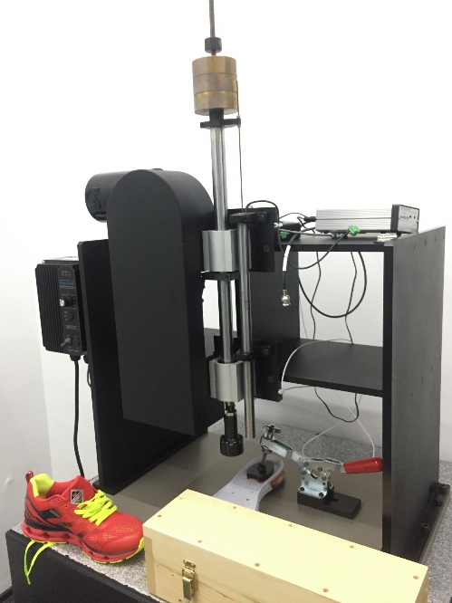 鞋冲击测试机:冲击试验机用以测试鞋底材料的抗变形能力,通过电机驱动配重块撞击测试物体。其冲击速度大约9秒/循环,下落质量为 8.5公斤,配重块头部直径为45毫米。