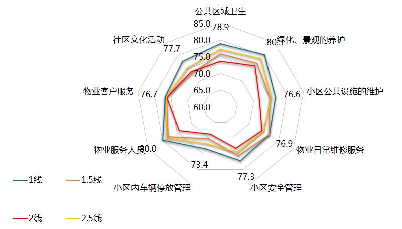 一线城市标杆企业除小区内车辆停放管理指标得分较低, 其余各项指标得分均比较高,其中绿化、景观的养护指标得分最高为80.3分;同时, 公共区域卫生、物业服务人员、小区内车辆停放管理、小区安全管理、物业日常维修服务指标满意度得分均因城市层级不同呈现出较为一致的规律性与差异性,城市层级越高则满意度得分越高,而物业客户服务、小区公共设施维护指标满意度得分并没有呈现出明显的层级差异。