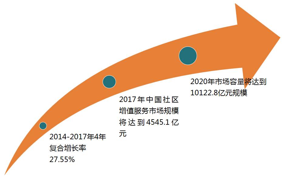 资本的逐利性,让物业服务领域的发展势头越来越猛,从房企开发全流程中的配角一跃成为大佬们眼中的“金矿”。自2014年开始,传统物业管理企业突然站在了万亿市场容量的社区O2O风口。某业内人士表示,“这在过去是不可想象的事情,现在互联网和资本市场都在向我们物业服务行业招手了,证明我们这个行业的投资价值正在得到社会的认可。”据中国指数研究院《2017中国物业服务百强企业研究》显示,2017年中国社区增值服务市场规模将达到4545.1亿元,2014-2017年4年的复合增长率为27.55%,按照这一复合增长率计算,到2020年市场容量将达到10122.8亿元规模。