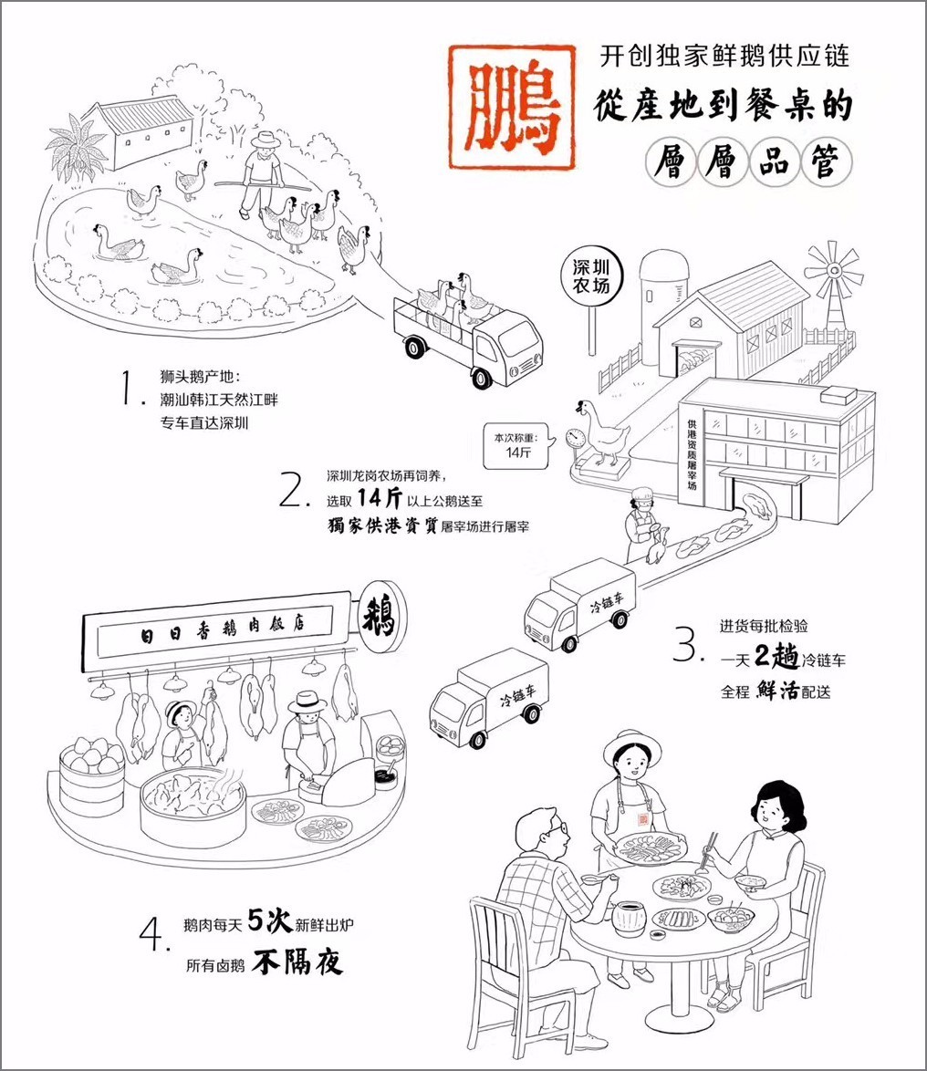 食材是日日香的核心竞争力,陈鹏鹏在深圳建起农场饲养狮头鹅,活鹅现宰,一天 2 次送到店,这是竞争对手短期内抄不来的。