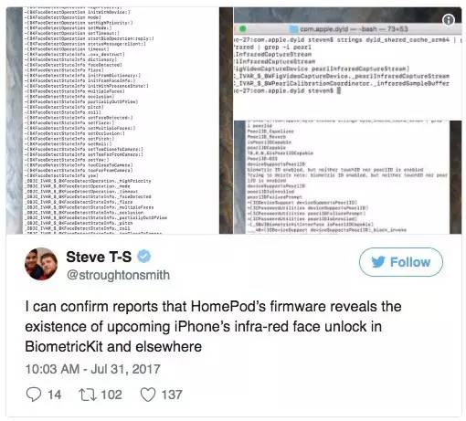 上周开始,苹果向软件开发商开放下载HOMEPod智能扬声器的固件代码,想用于年底推出相关固件。这个无心之举,却被一位国外的开发者“盯上”,仔细一研究发现了iPhone8“最大的秘密”。