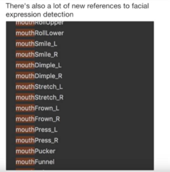 更有意思的是,在人脸识别的代码中,史密斯还发现人脸识别还提供了表情识别的接口,通过这些接口可以探测到摄像头前的人做出的不同表情。目测会有iPhone8上市后会有人借助表情接口,开发出有趣的APP,想想很激动呢!