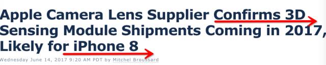 此外,就在上个月,知名的苹果供应商Largan Precision布,将于2017年下半年出售大量的3D深度感应镜头。虽然它没有爆料购买者的品牌身份,但多数行业专家认为这些相机组件就是针对iPhone8的!