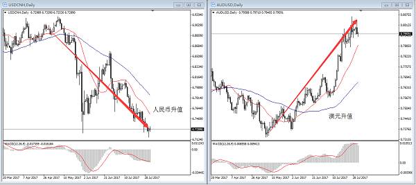 所以中国经济的好坏也直接影响了澳大利亚经济的发展。澳元和人民币的关系也基本上呈现的是正相关的,今年5月以来,人民整体处于升值态势,而澳元更是同期以来不断上涨。