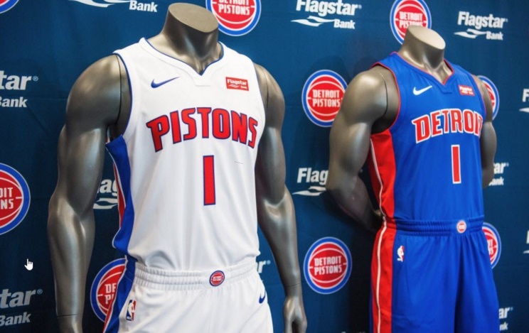 活塞的球衣以白、蓝色为主,样式简约。活塞队已经与美国旗星银行达成球衣广告协议,美国旗星银行的广告由此出现在了球衣上方,且红色的广告标志与球衣颜色非常搭配。