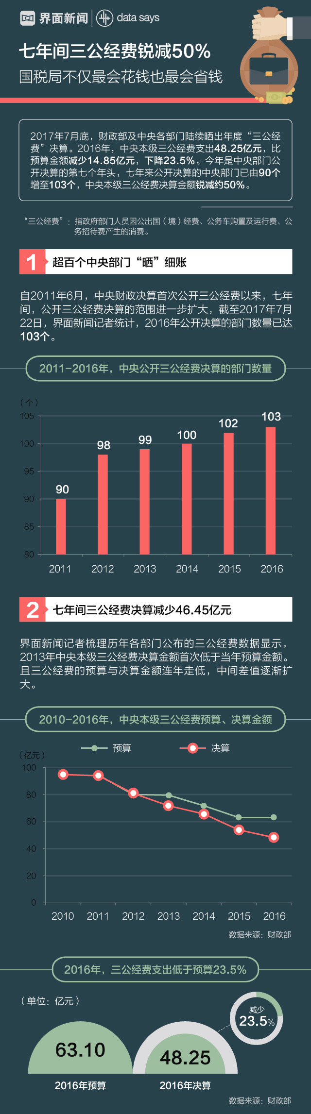 2017年是中央部门公开决算的第七个年头,七年来公开决算的中央部门已由90个增至103个,中央本级三公经费决算金额锐减46.45亿元。