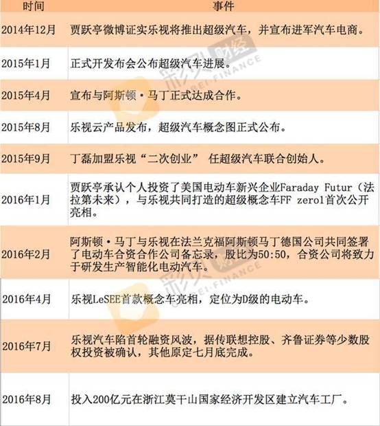 贾跃亭是在2014年宣布造车的,到2016年8月,乐视汽车看起来发展的一切顺利。问题始于2016年底,乐视投资电动车制项目被质疑停产,贾跃亭承认乐视面临资金困难。
