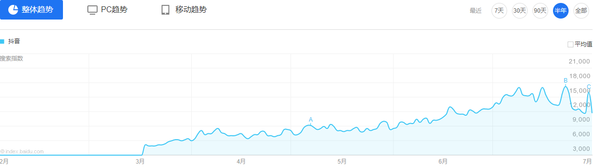 通过上面的百度指数可以看到,在今年3月之前,抖音的搜索指数一直都为0。而直到3月才显示指数型的上升,为什么?
