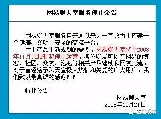 2008年10月21日,网易停止了聊天室的运营,网易聊天室的关闭意味着一个时代的结束。一方面是政策监管的原因,一方面是QQ等新的交流工具的兴起,聊天室和传呼一样,是时代局限的产物,被更先进的形式取代了。