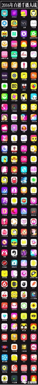 熊猫、触手、A站、哔哩哔哩站、网易CC、战旗、 九秀、奇秀、全民、火猫、 小米互娱、狮吼,基本上可以占据中国直播行业的半壁江山了。